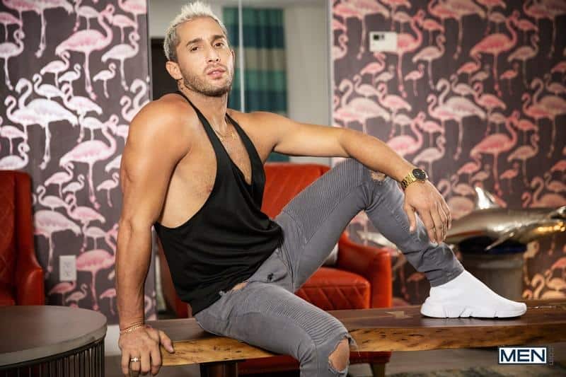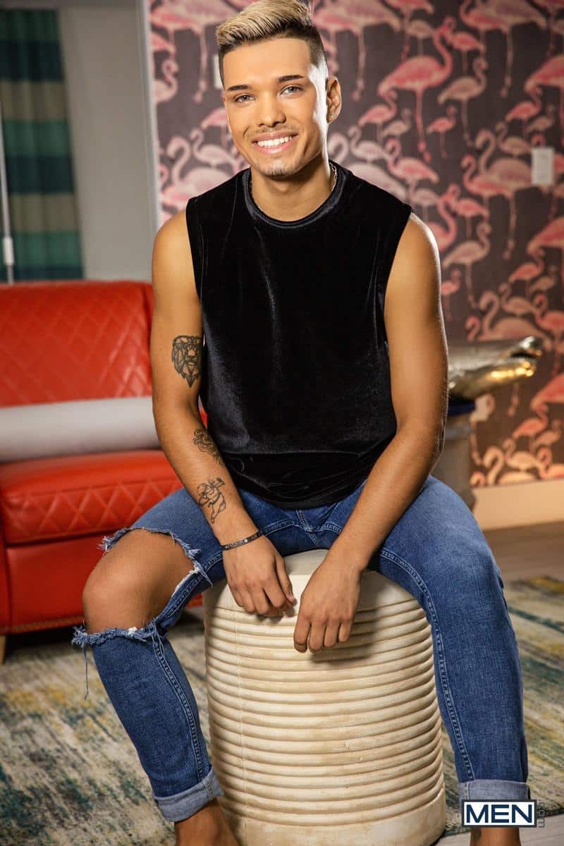 Leo sucks Armando and rides his cock before the top pounds him on the table till he blows his load on Leo’s ass.